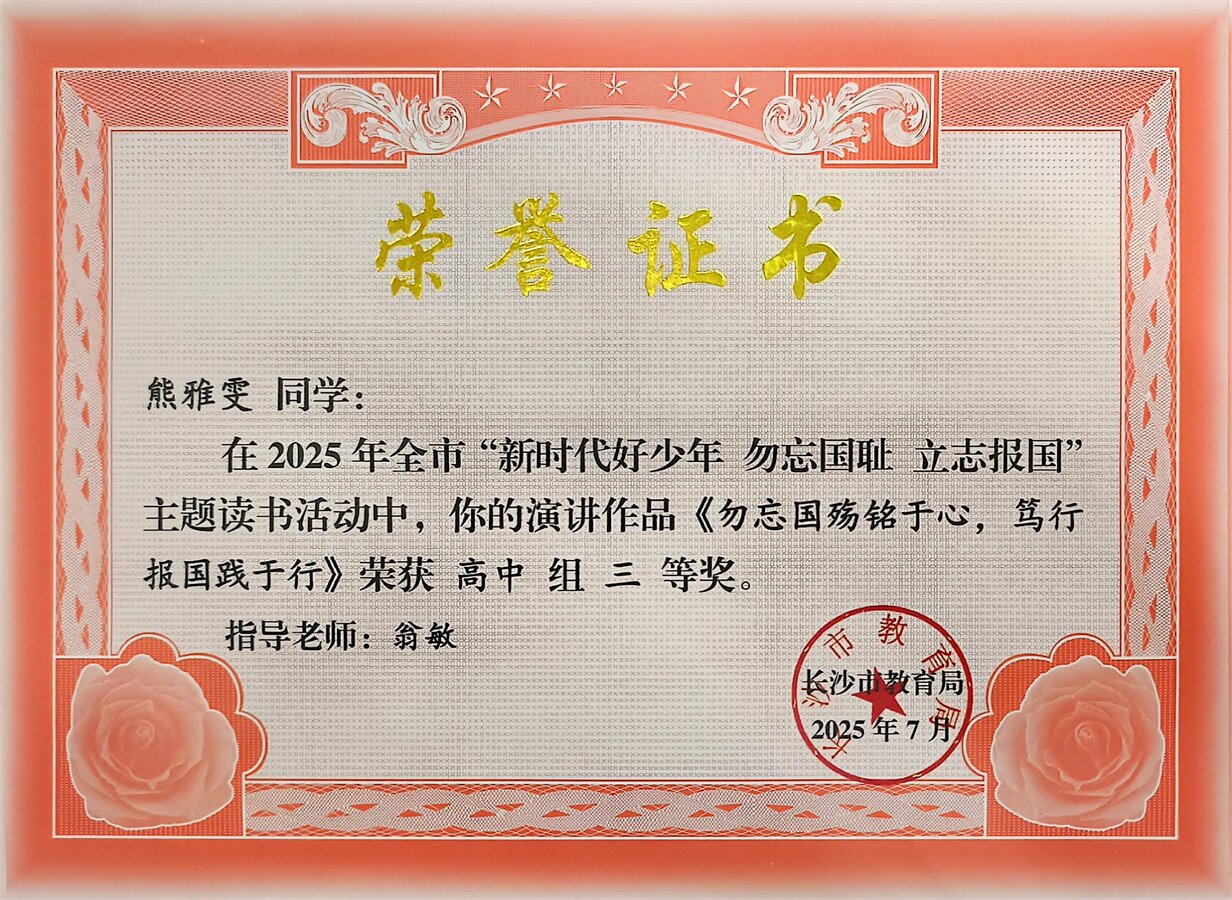 作为望城区“我们的韶华映朝阳——‘雷小锋’超能阅读季之中小学生‘新时代好少年’”主题教育读书活动的优秀组织单位,我校在此次活动中同样硕果盈枝。在演讲类评选中,我校熊雅雯同学在翁敏老师的指导下,凭借出色的演讲技巧和深刻的内容理解脱颖而出,荣获市级三等奖。作为望城区唯一一所在此次市级演讲类获奖的民办中职学校,这一成绩充分彰显了学校在语文素养与爱国主义教育方面的丰硕成果。此前,熊雅雯同学已在区级比赛中斩获望城区高中组唯一一个特等奖。